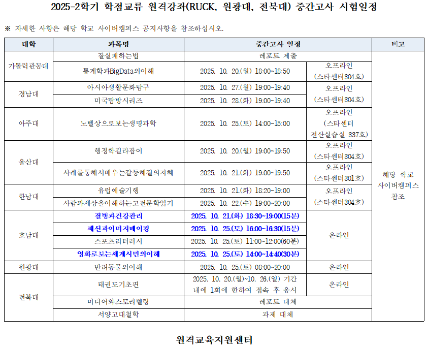 [필독] 2025-2학기 학점교류 원격강좌(RUCK, 원광대, 전북대) 중간고사 안내(호남대 일정 정정)
